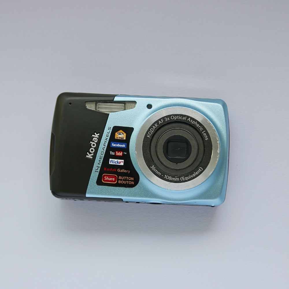 Una cámara compacta digital clásica del año 2010 capaz de capturar tanto fotografías como vídeos. Con flash incorporado, pantalla LCD y varios modos de disparo.