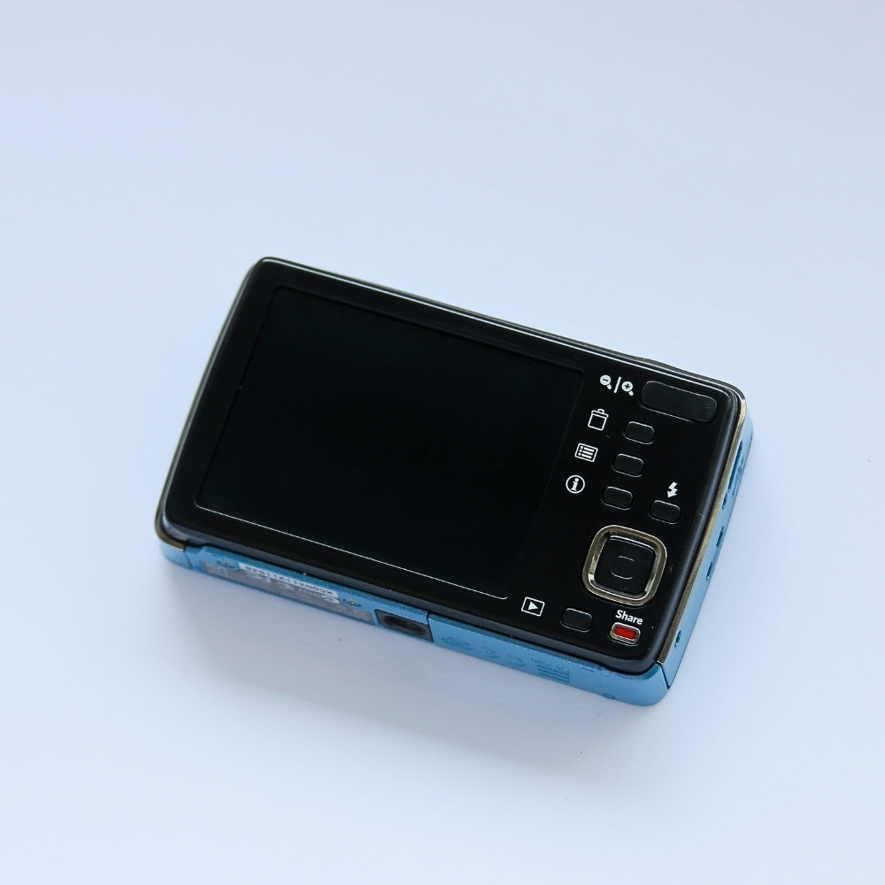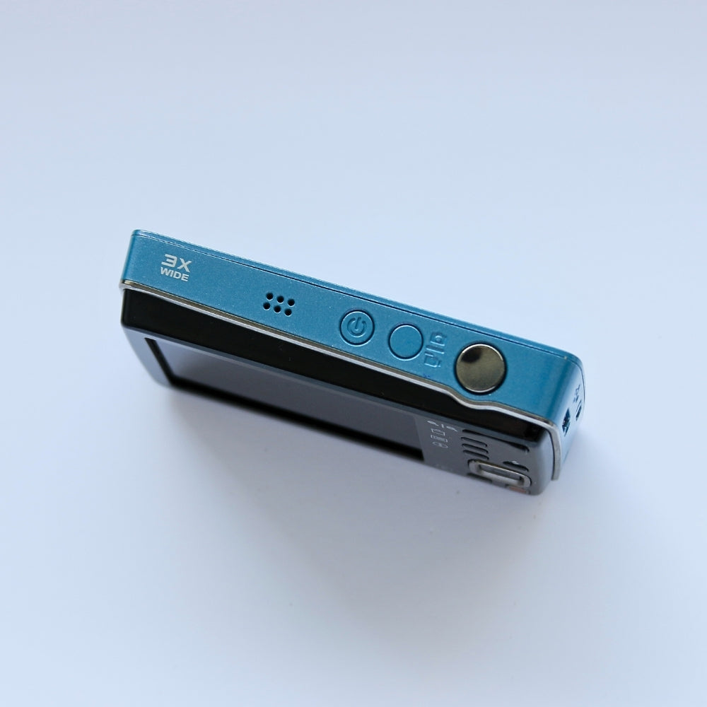 Una cámara compacta digital clásica del año 2010 capaz de capturar tanto fotografías como vídeos.  Con flash incorporado, pantalla LCD y varios modos de disparo.